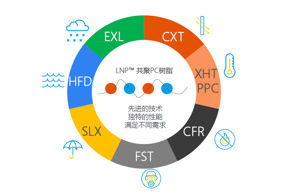 沙特基础工业公司(SABIC)的LNPTM ELCRESTM 共聚PC主要分成7大类,为高贵的客人们提供客制化的优质服务,满足客户在不同领域、不同应用或不同场景的多样化需求。 (1) EXL系列特色:低温耐冲击 (2) CXT系列特色:更高的耐热性 + 透明性 + 易成型性(HDT 175~215℃) (3) XHT系列特色:高耐热(HDT 145~185℃) (4) CFR系列特色:薄壁 + 透明 + 阻燃 (5) FST系列特色:阻燃 + 低烟雾 + 低毒性 (6) SLX系列特色:优越的耐候性 (7) HFD系列特色:高韧性 + 高流动性