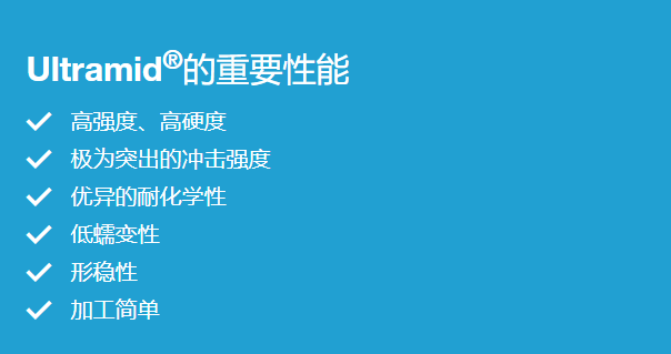 | 玻纤增强级 | Ultramid® B3WG7 | 尺寸稳定性好 耐热老化 高刚性 耐油 | 典型应用包括汽车离合器和油门踏板 | 物性表 |